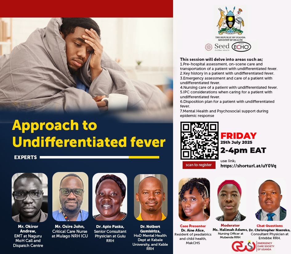 Dear Esteemed Health Worker, The Department of Emergency Medical Services at the Ministry of Health invites you to this week's EMS ECHO Session as we talk about; 1.Pre-hospital assessment, on-scene care and transportation of a patient with undifferentiated fever. 2.Key history in a patient with undifferentiated fever. 3.Emergency assessment and care of a patient with undifferentiated fever. 4.Nursing care of a patient with undifferentiated fever. 5.IPC considerations when caring for a patient with undifferentiated fever. 6.Disposition plan for a patient with undifferentiated fever. 7.Mental Health and Psychosocial support during epidemic response Date: Friday Jul 25, 2025 Time: 2 - 4 PM EAT Registration Link https://seedglobalhealth-org.zoom.us/meeting/register/VcRjO6gcTBGBc9kzA3BURw CPD points will be awarded. Attached is the session flyer. Best Regards, EMS ECHO Secretariat.